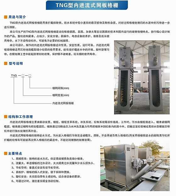 内进流网板格栅是一种目前新型的细格栅清污设备,采用连续拦截并清除流体中的固体杂物,可以达到较好的清污效果。如扁平的固体、杂草、瓜壳等,尤其是传统细格栅难以拦截的毛发纤维类污物,可大大降低后续处理工序的负荷。